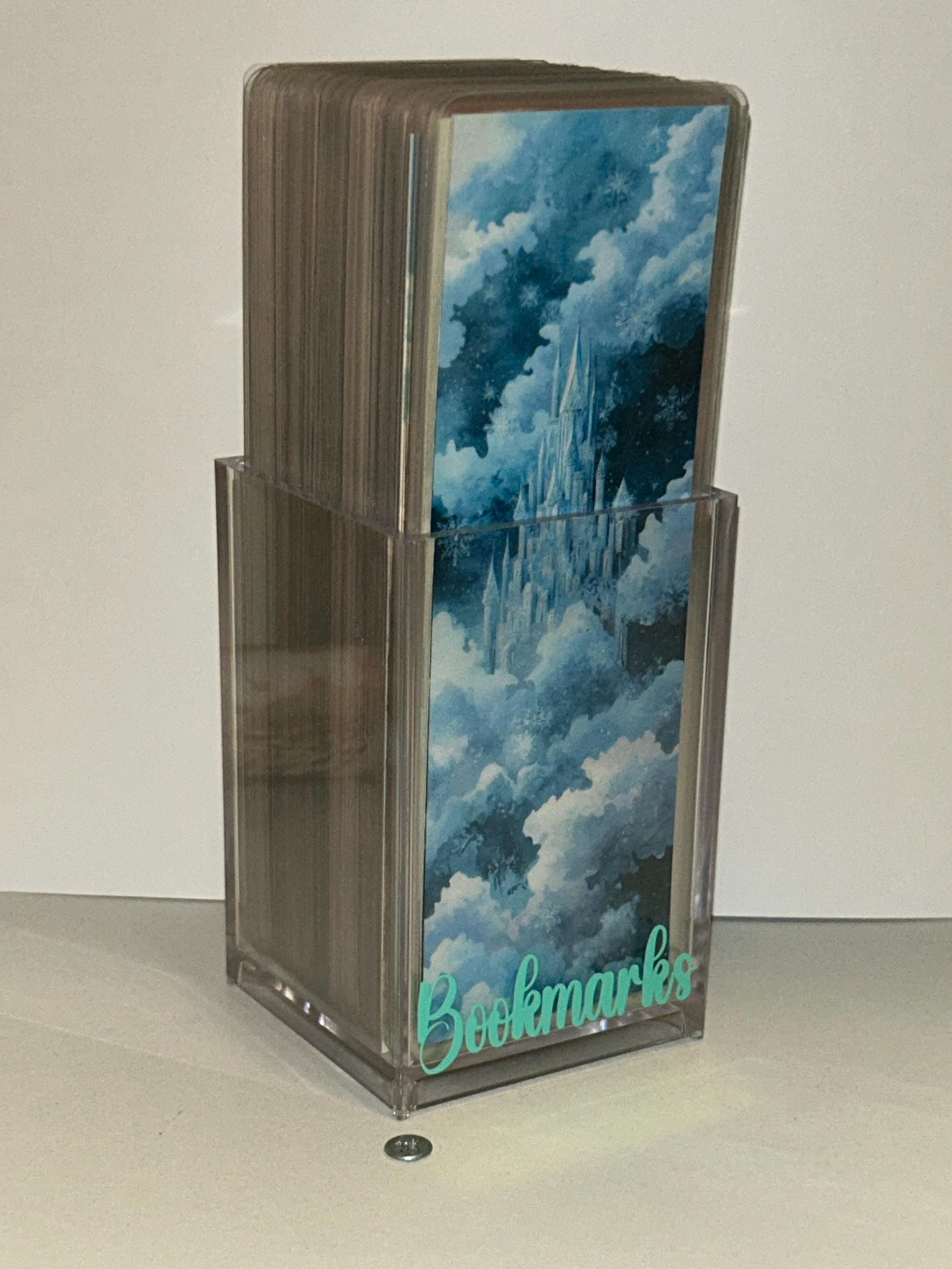 Keep your bookmarks organized in style with this handmade acrylic and vinyl bookmark holder. Crafted with durability and elegance in mind, this holder features a sleek acrylic base with vinyl embellishments that add a touch of personality and charm. Perfect for book lovers, it keeps your favorite bookmarks easily accessible while doubling as a decorative piece. Whether placed on a desk, bookshelf, or nightstand, this unique bookmark holder is a must-have for keeping your literary accessories neat and tidy.