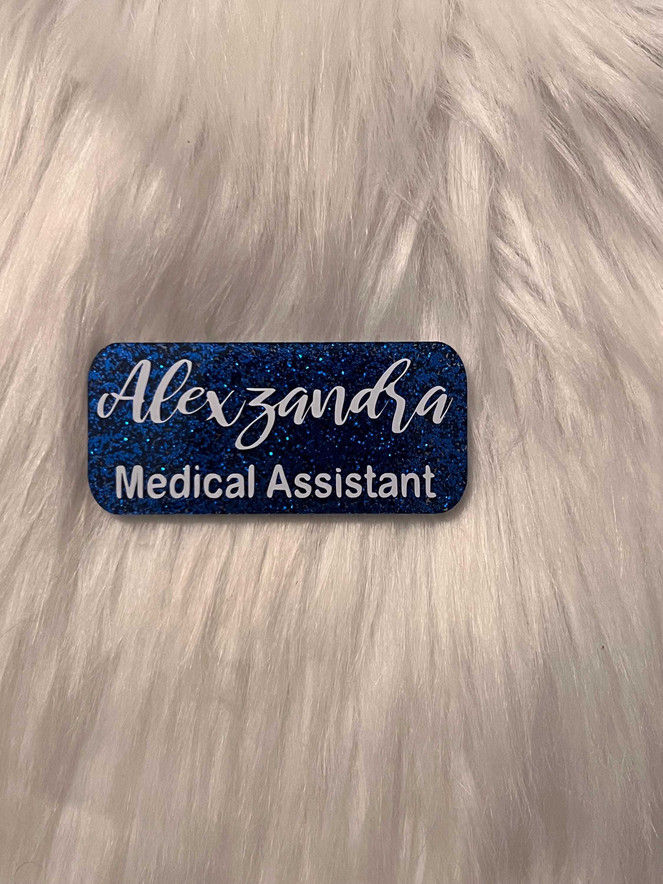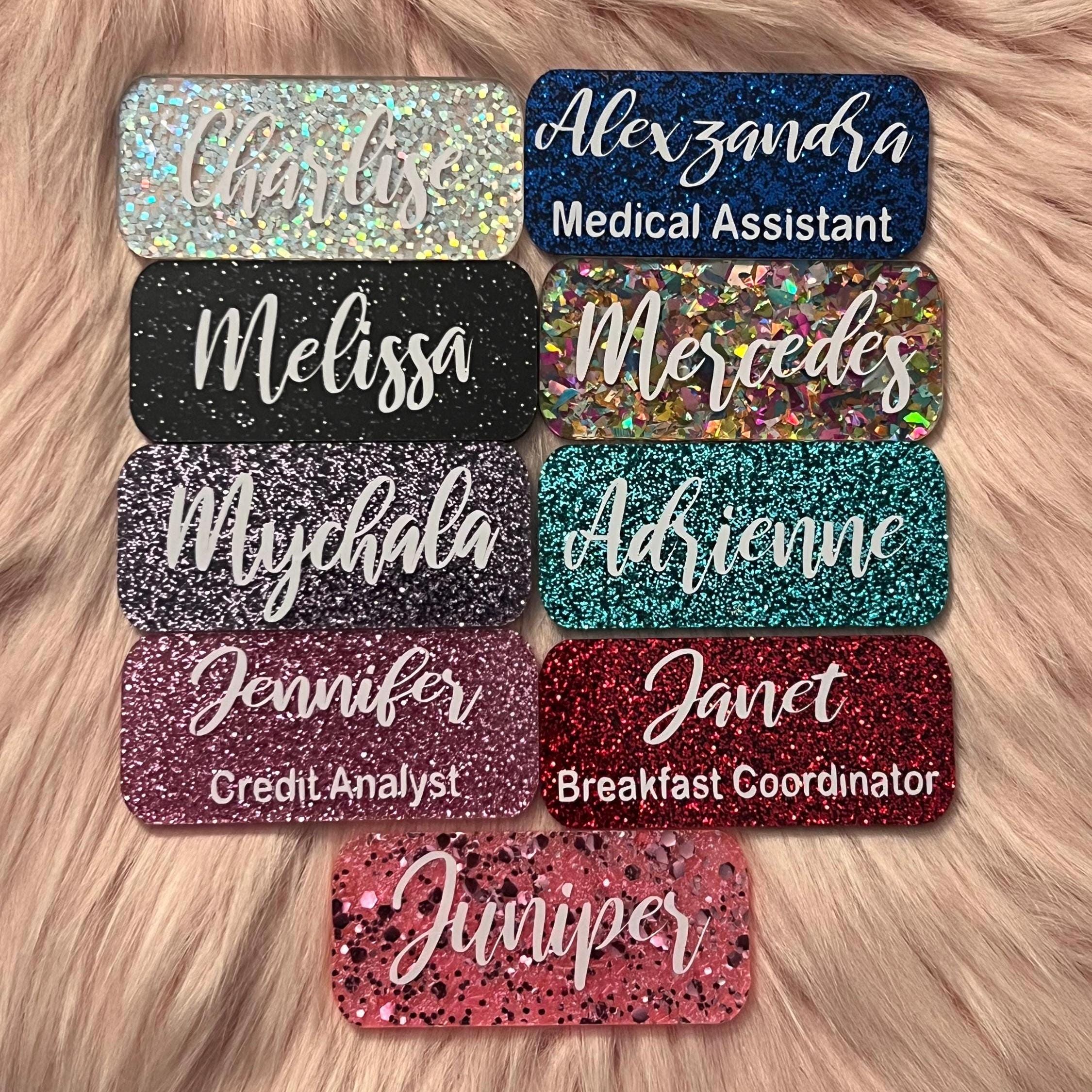 Custom glitter name tag with magnet attachment. READ ME BEFORE PURCHASING!