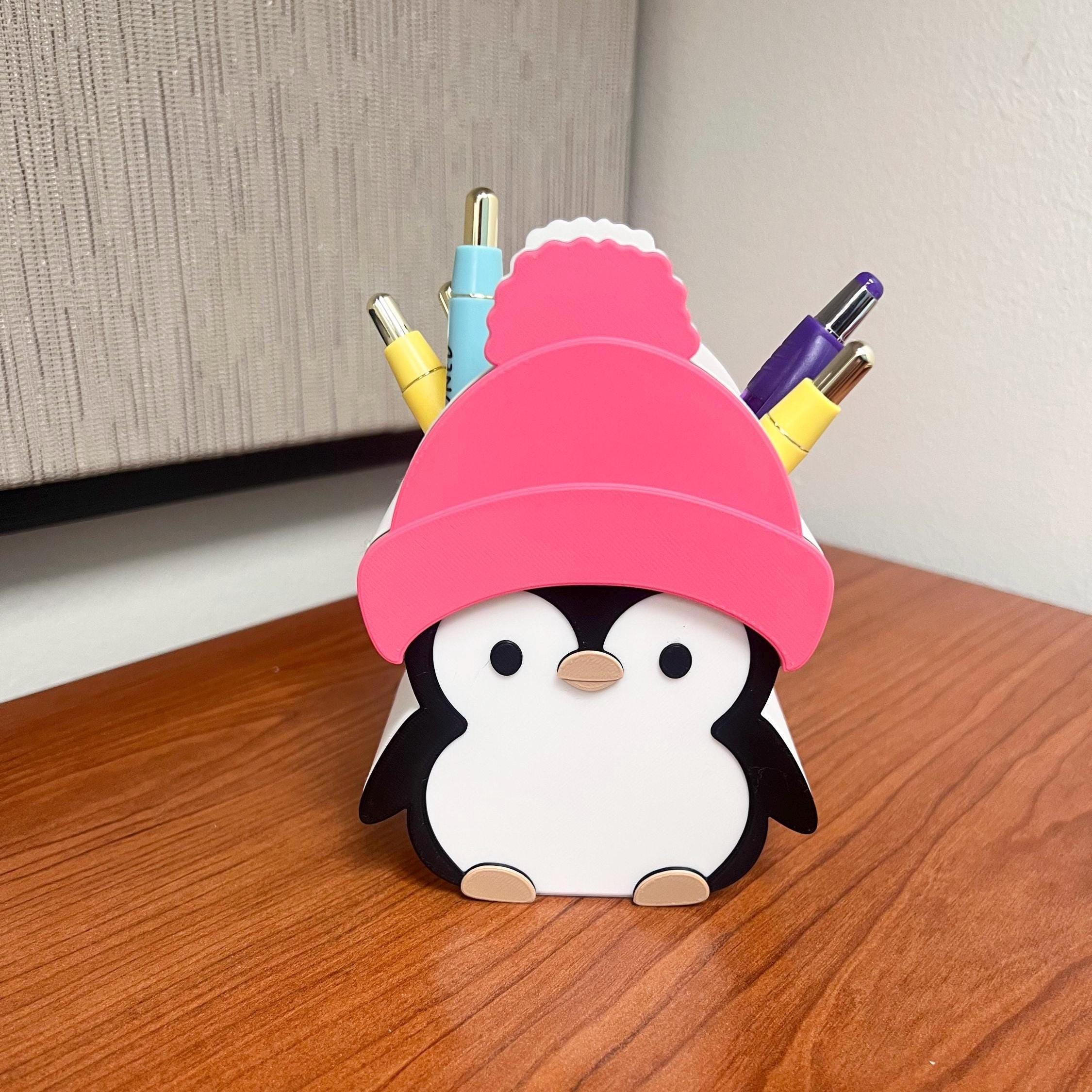 This adorable 3D‑printed penguin wearing a cozy little hat is the perfect way to add personality and charm to any workspace, classroom, makeup station, or craft area. Designed to be both cute and functional, this penguin happily holds your pens, makeup brushes, art tools, or anything else that needs a stylish home.